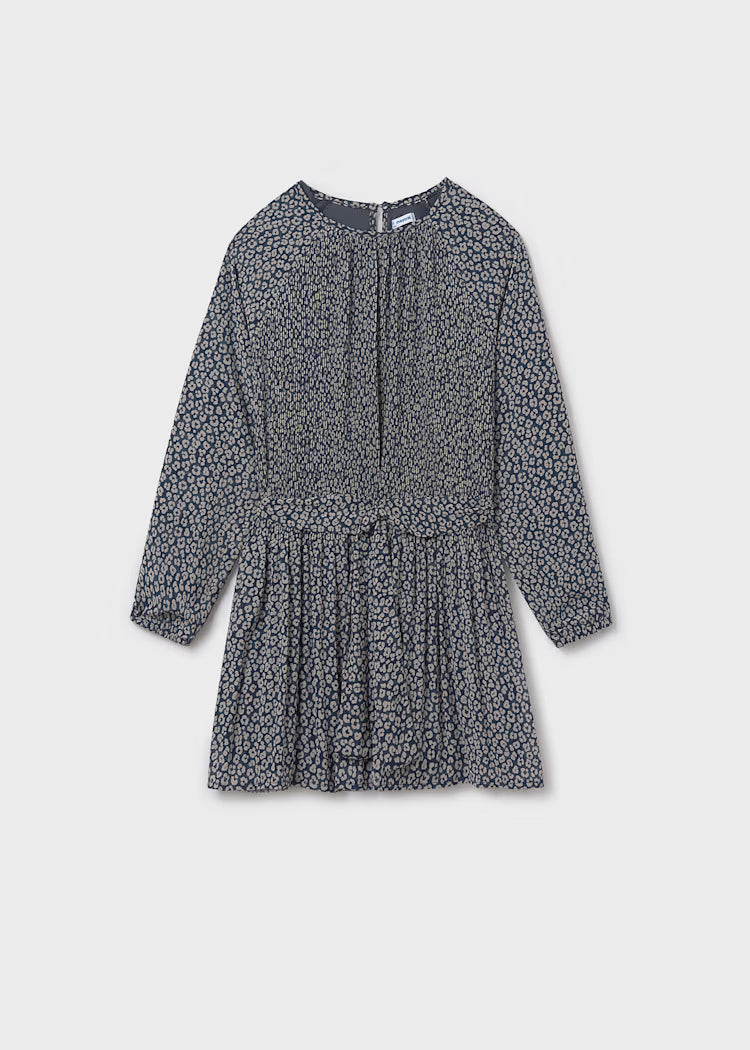 Deep blue animal print dress with tiny pleats and tie waist. Zipper back.
