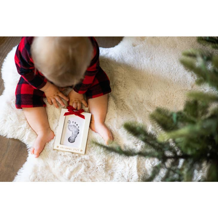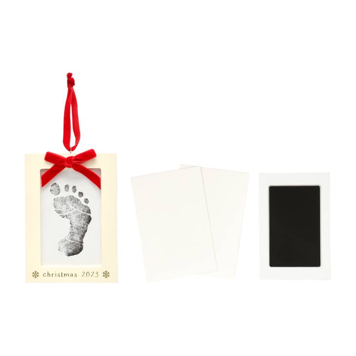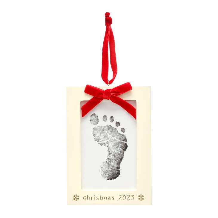 Cherish your little one’s prints this Christmas with Pearhead’s Baby’s Prints Holiday Ornament. This ornament photo frame is perfect for celebrating baby’s first Christmas • Includes a rectangular wooden and glass frame with the words “Christmas 2023” and snowflake design, an attached red velvet ribbon bow to hang from your Christmas tree, a turn tab to easily insert your baby’s footprint or handprint, 1 clean touch ink pad, and 2 imprint cards with included instructions
