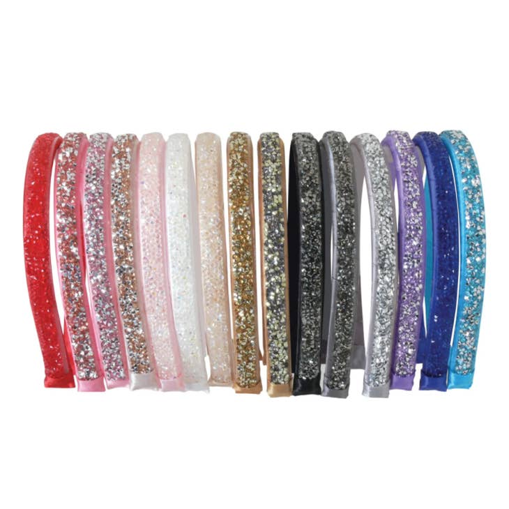 Sparkling rhinestones on a hand-wrapped 1/2" satin headband with gripper to help hold headband in place.