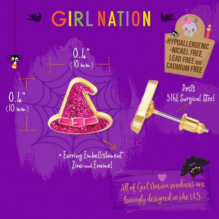 Limited Edition! Bring a dash of spook-tacular delight to the Halloween season with our bewitching Halloween Earring Collection for girls! Cast a spell with glittering witch hat earrings, a magical addition to Halloween attire. Your next favorite fall find, earrings come packaged on adorable pumpkin shaped jewelry cards.