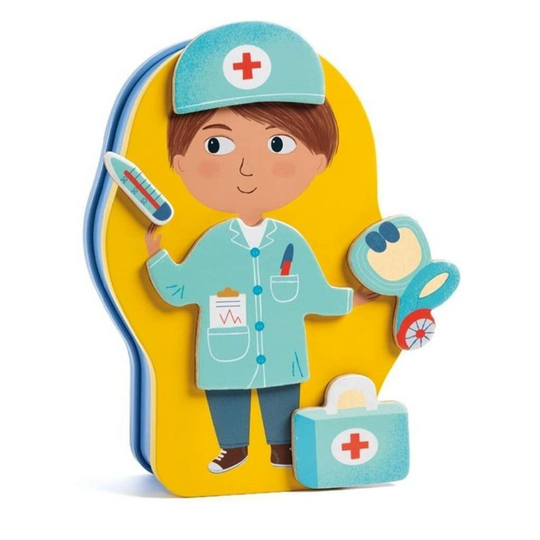 A new way to play with mix and match magnets, double the fun as you can build a doctor and firefighter at once on the metal, 2-sided box