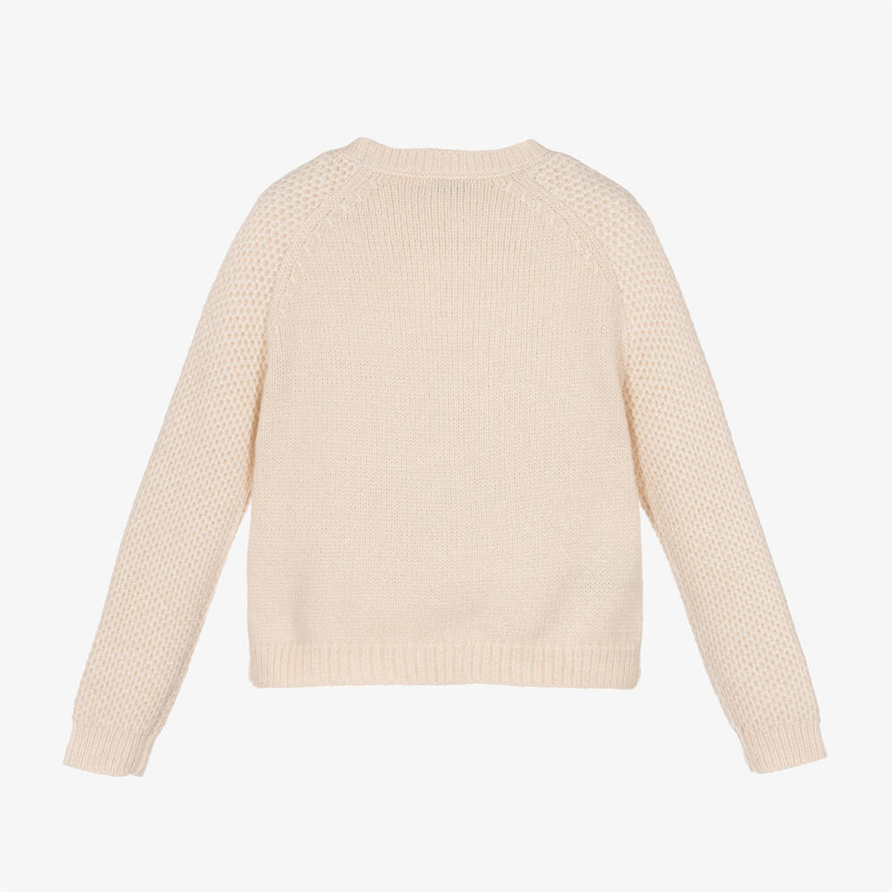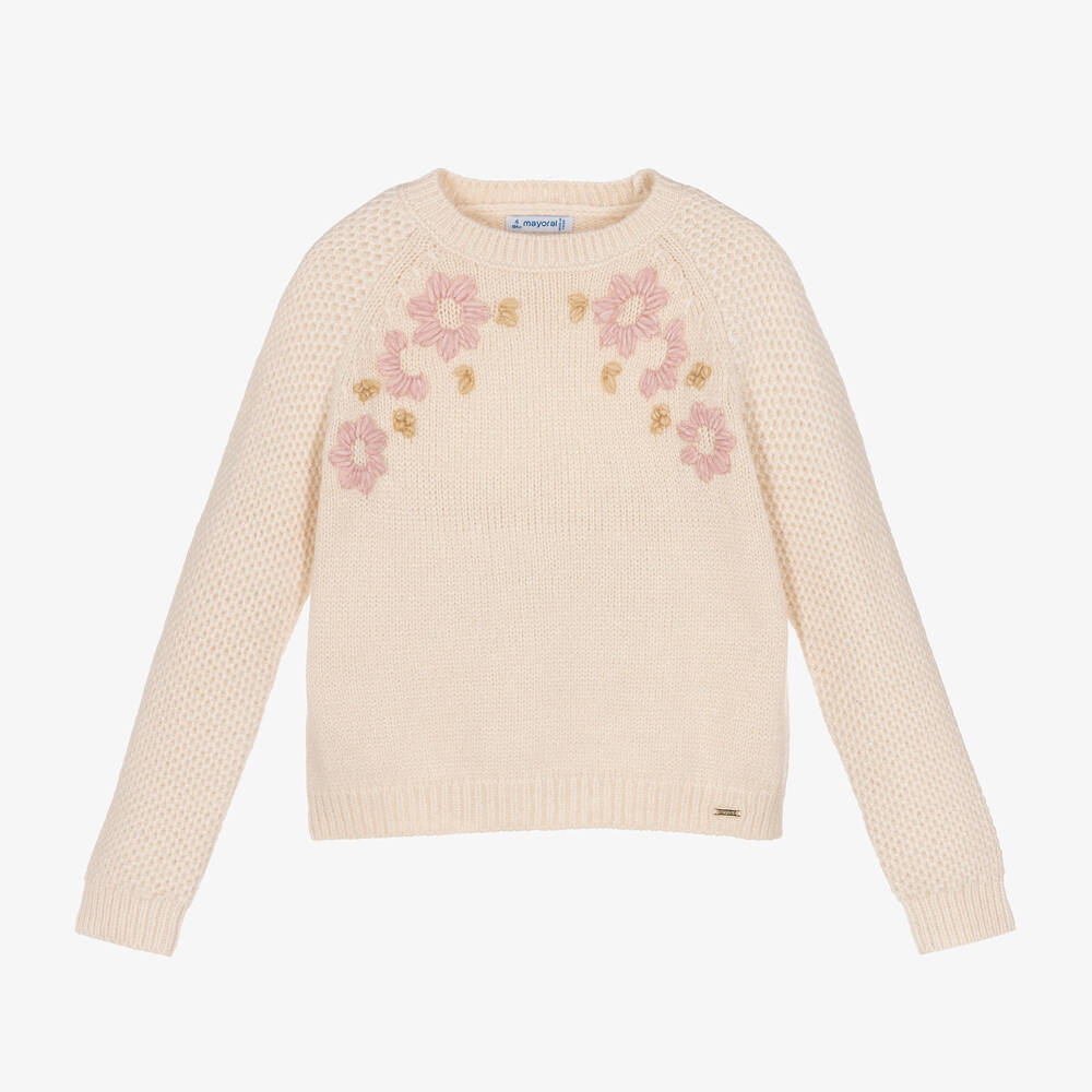Lovely ivory sweater for girls by Mayoral, made in a super soft knit with metallic threads for a touch of sparkle. This casual sweater has long sleeves with a striking honeycomb pattern and there are cosy ribbed trims. For a pretty finish there are pink and beige embroidered flowers on the front.