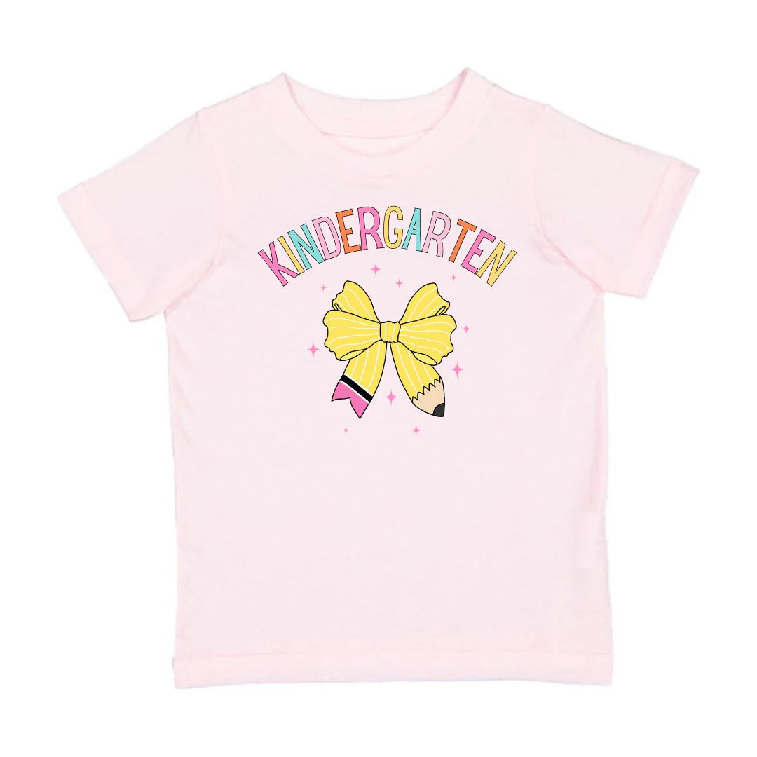 Kindergarten pencil bow graphic on ballet pink short sleeve t-shirt