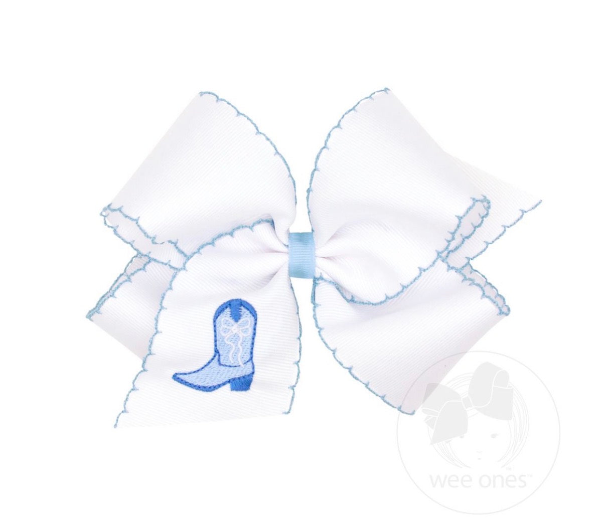 King Moonstitch bow, light blue trim with blue cowboy boot.