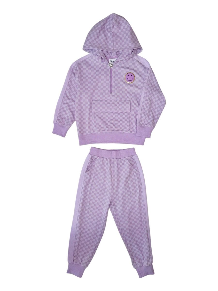 - Trendy lavender checkered two-piece set featuring a half-zip hoodie and joggers with side stripes.