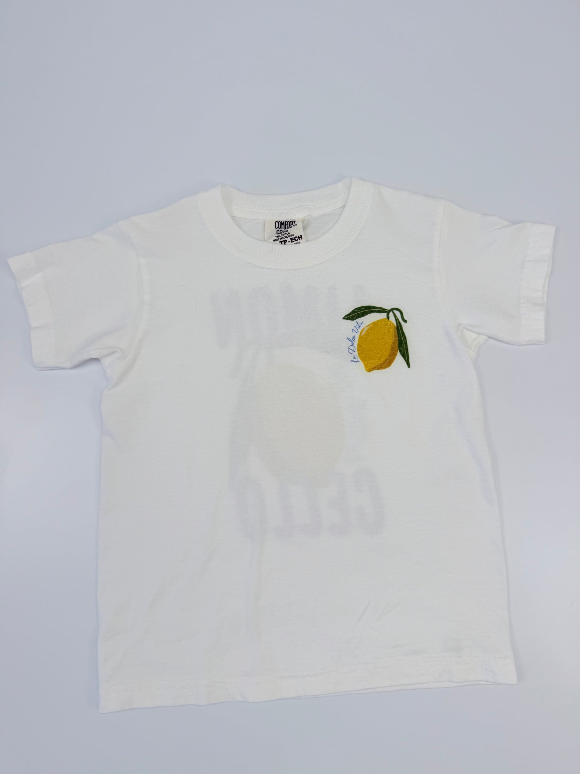 White Comfort Color short sleeve tee with front pocket lemon graphic and back Limoncello graphic.