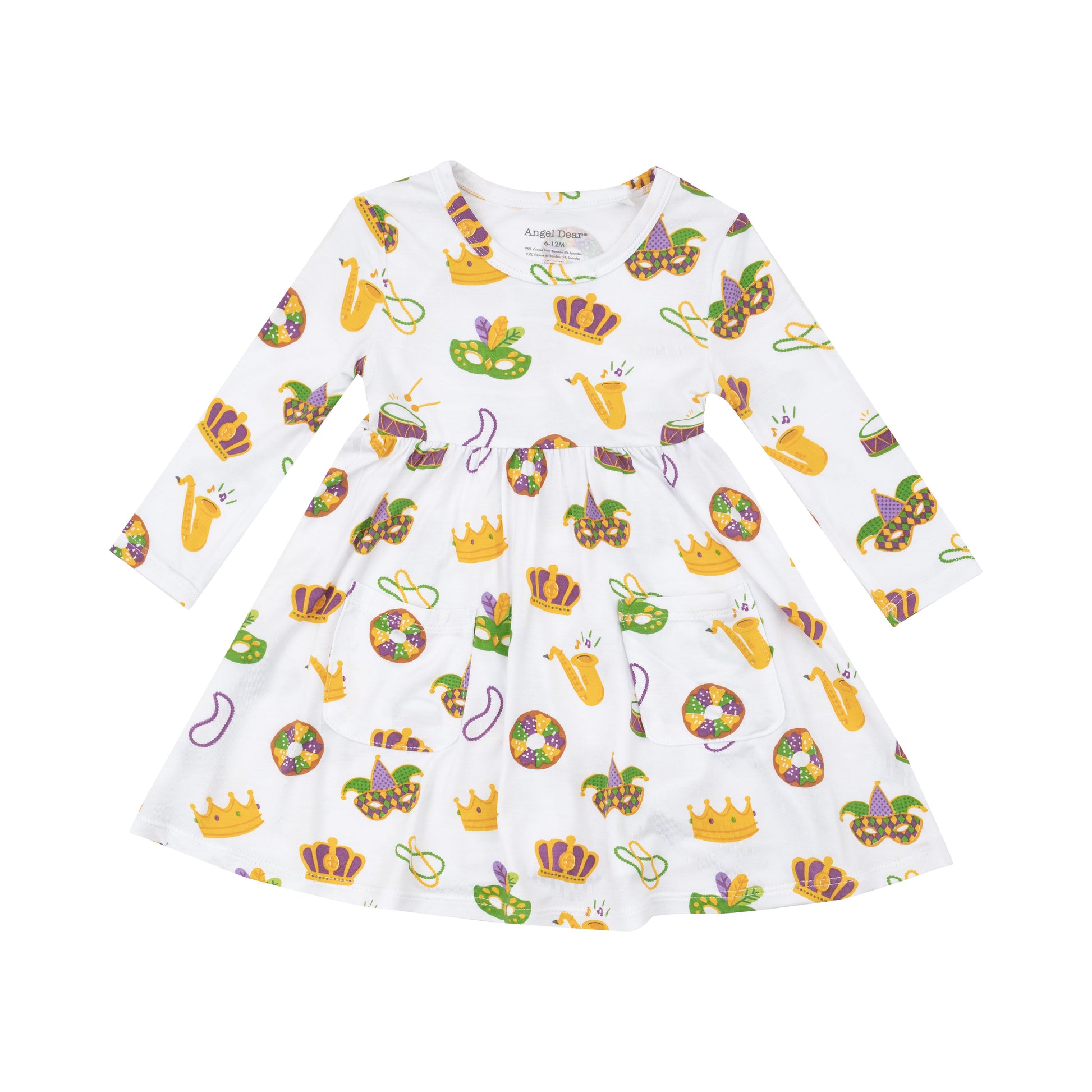 Bamboo White Mardi Gras Long Sleeve Pocket Twirl Dress.