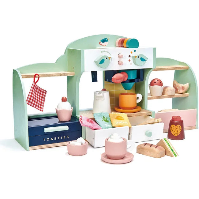 Do you want to own a coffee shop and be a proper Baritsta? Welcome to the Bird's Nest Café where you can play with: Panini Toaster 5 different colored pods 2 clacking dials Milk jug and steamer spout 2 cups, 2 plates and 1 potholder Knife, fork, and spoon Sugar cubes and chocolate shaker 2 coffee discs and 3 different toppings 3 flavored tea bags in fabric packs 1 sandwich, 2 paninis, 3 pastries and 2 cupcakes Menu stickers For ages: 3+ years.