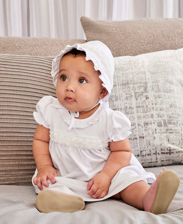 Adorable miniature roses add a beautiful touch to this baby girls' dress set, complete with a diaper cover. Made from 100% Pima cotton for a soft and comfortable fit.