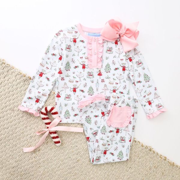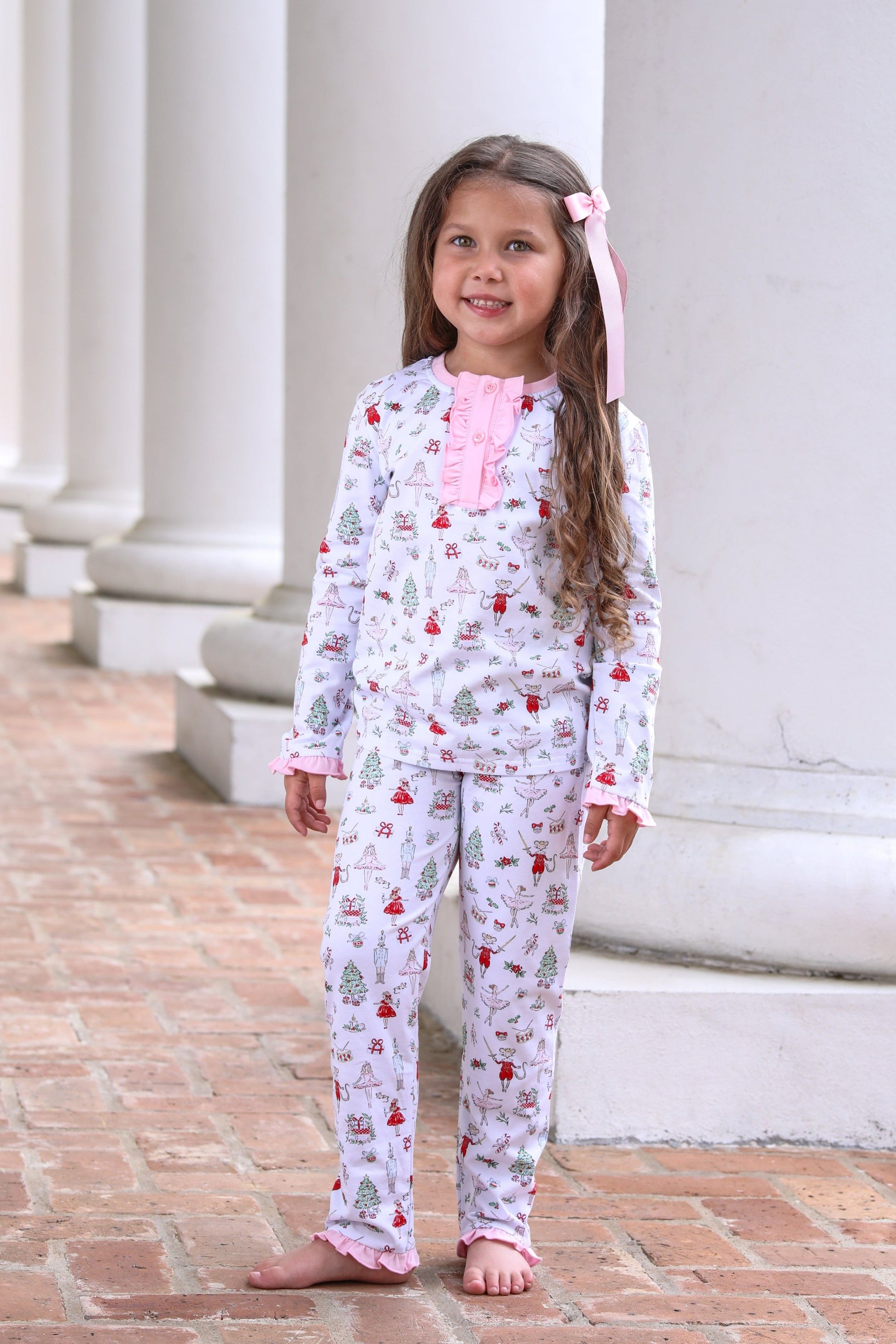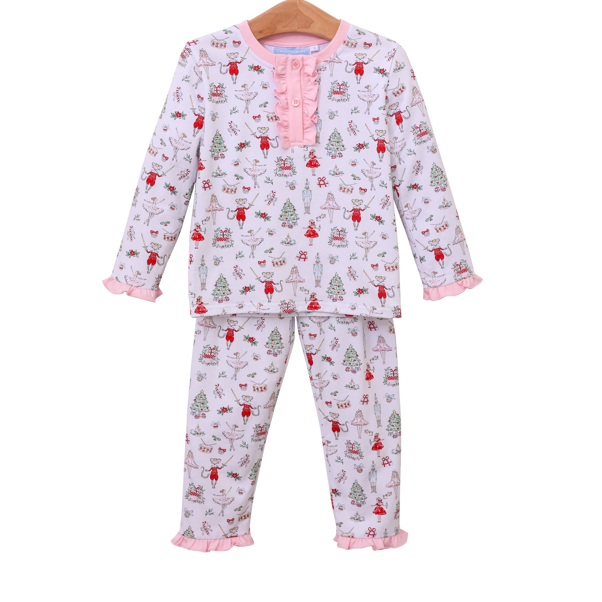 Nutcracker print PJ set with ruffle detail and back ruffle pockets.
