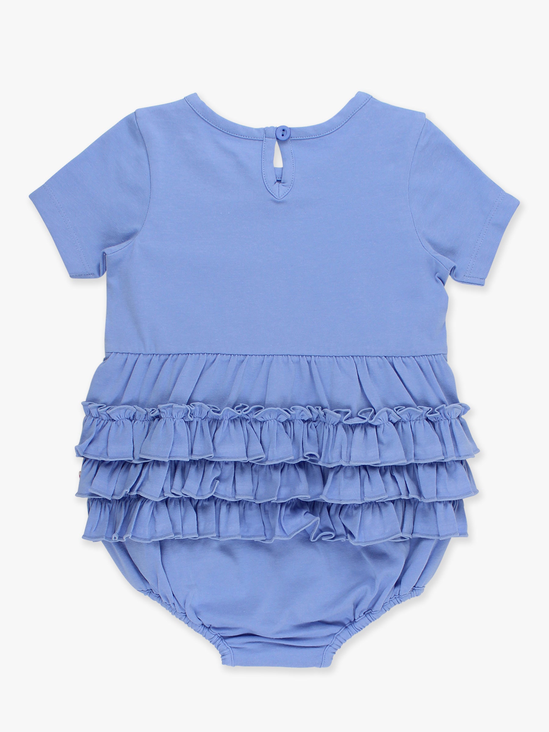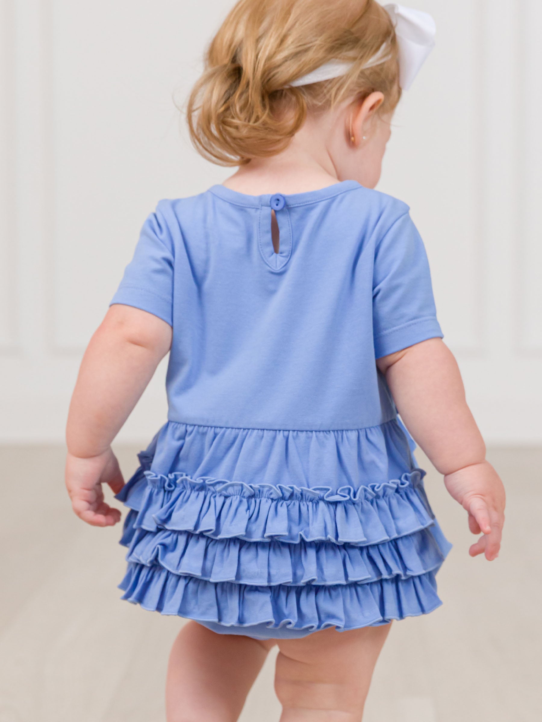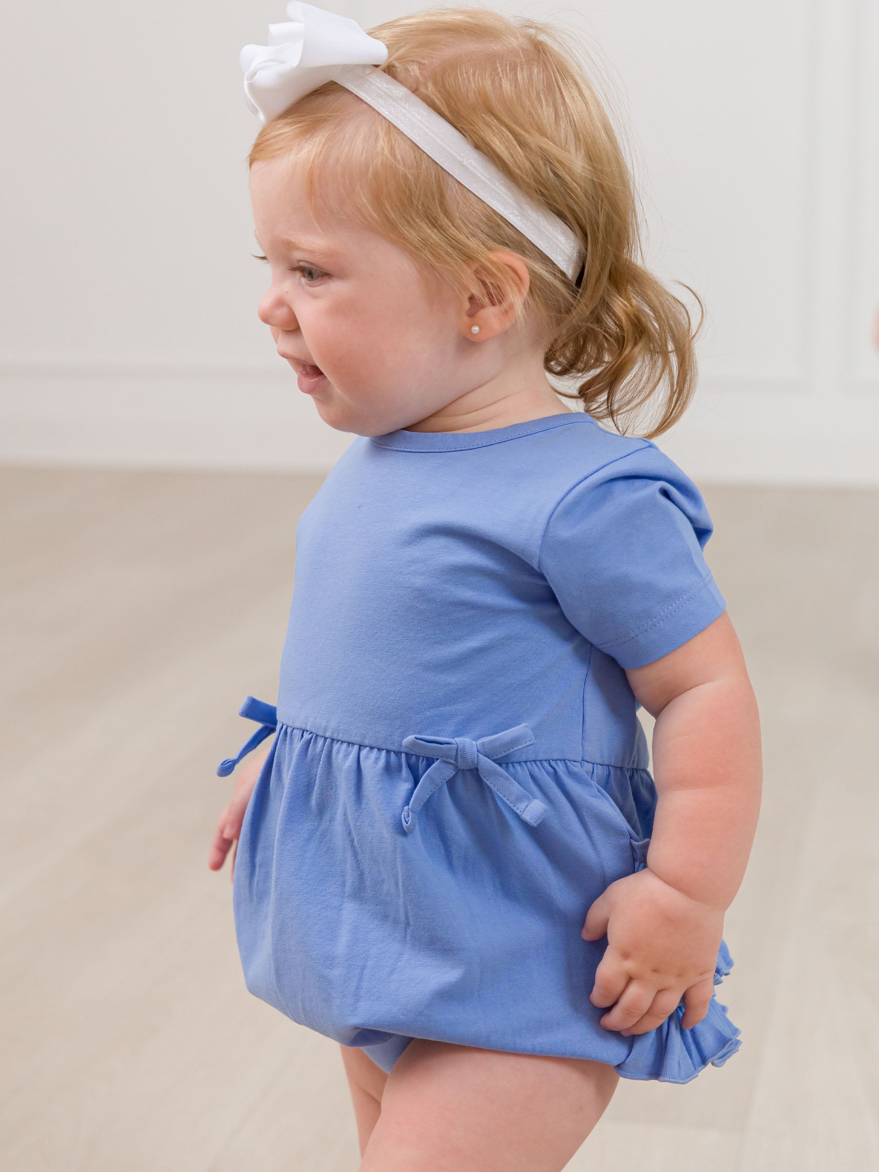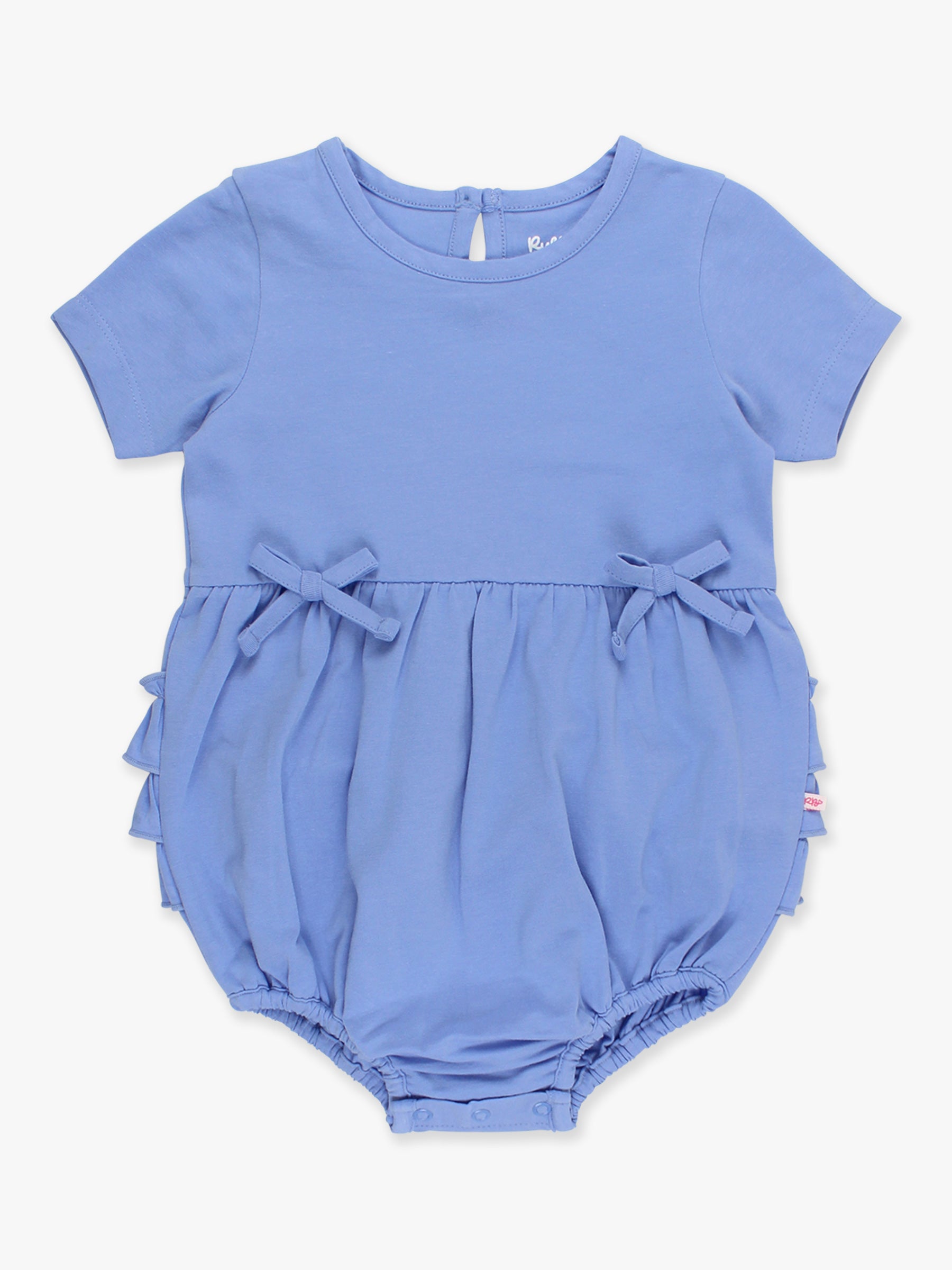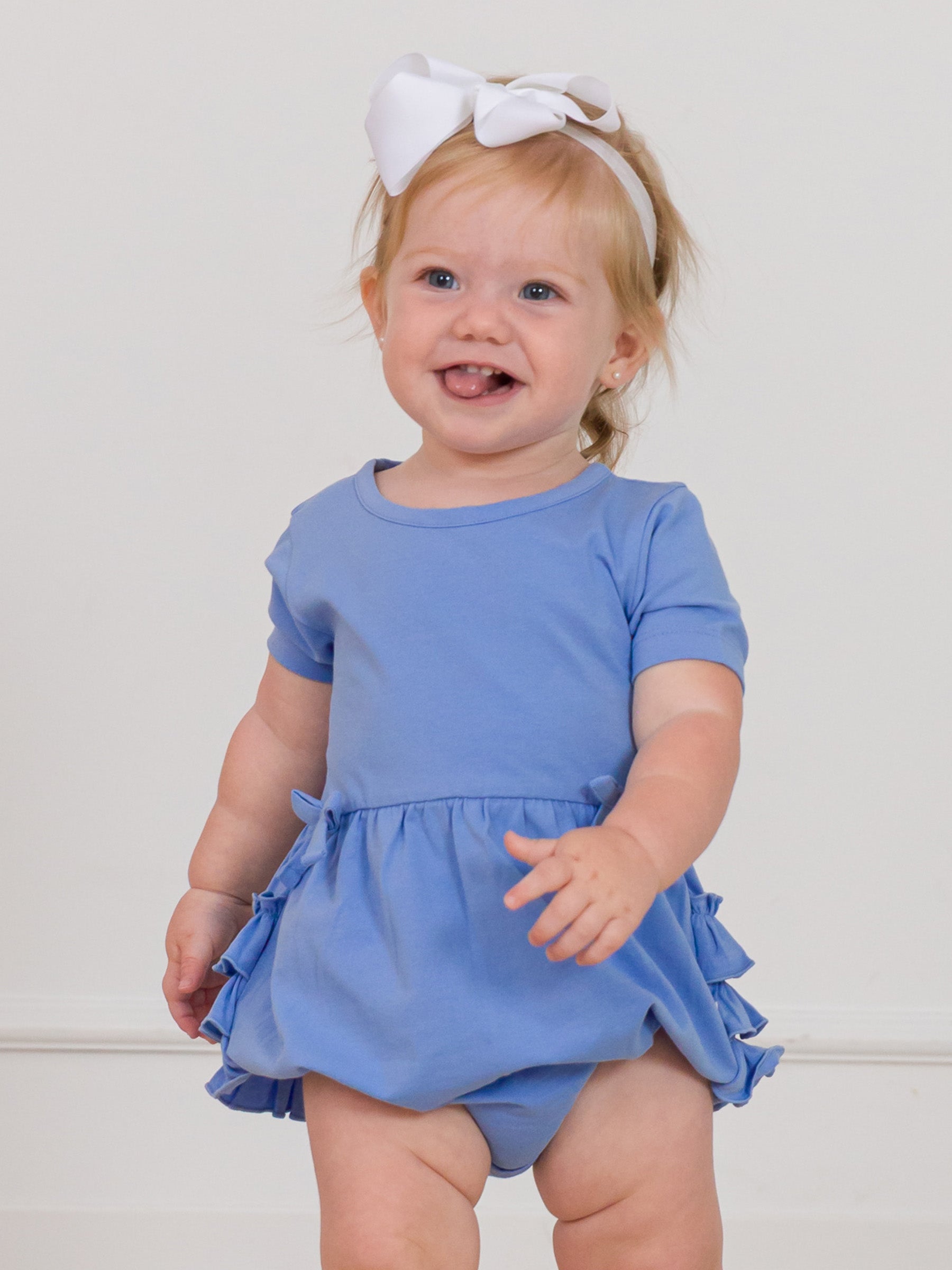 The beautiful, classic blue shade never goes out of style! This sweet knit bubble romper features tiny bow details at the waist and layers of signature rear ruffles for added cuteness.