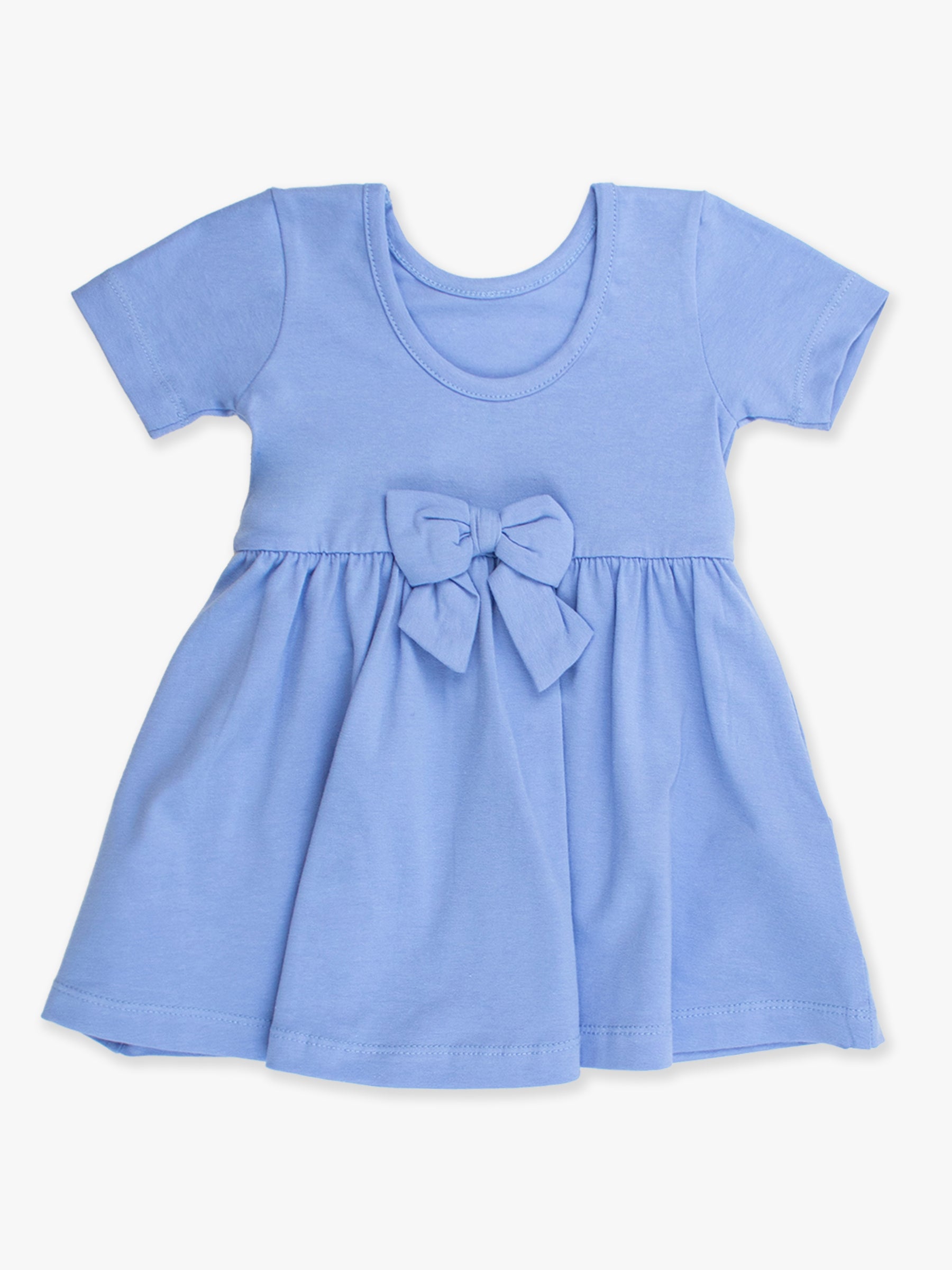 The beautiful, classic blue shade never goes out of style! Our bestselling short sleeve twirl dress is a must-have addition to any little girl's wardrobe. Crafted from high quality knit fabric, this dress is gentle on skin, ensuring a comfortable fit and easy wear. Functional pockets make it practical, and a sweet bow accent on the back adds the perfect girly touch! Wear alone during warm weather or layer with a sweater during the colder months.