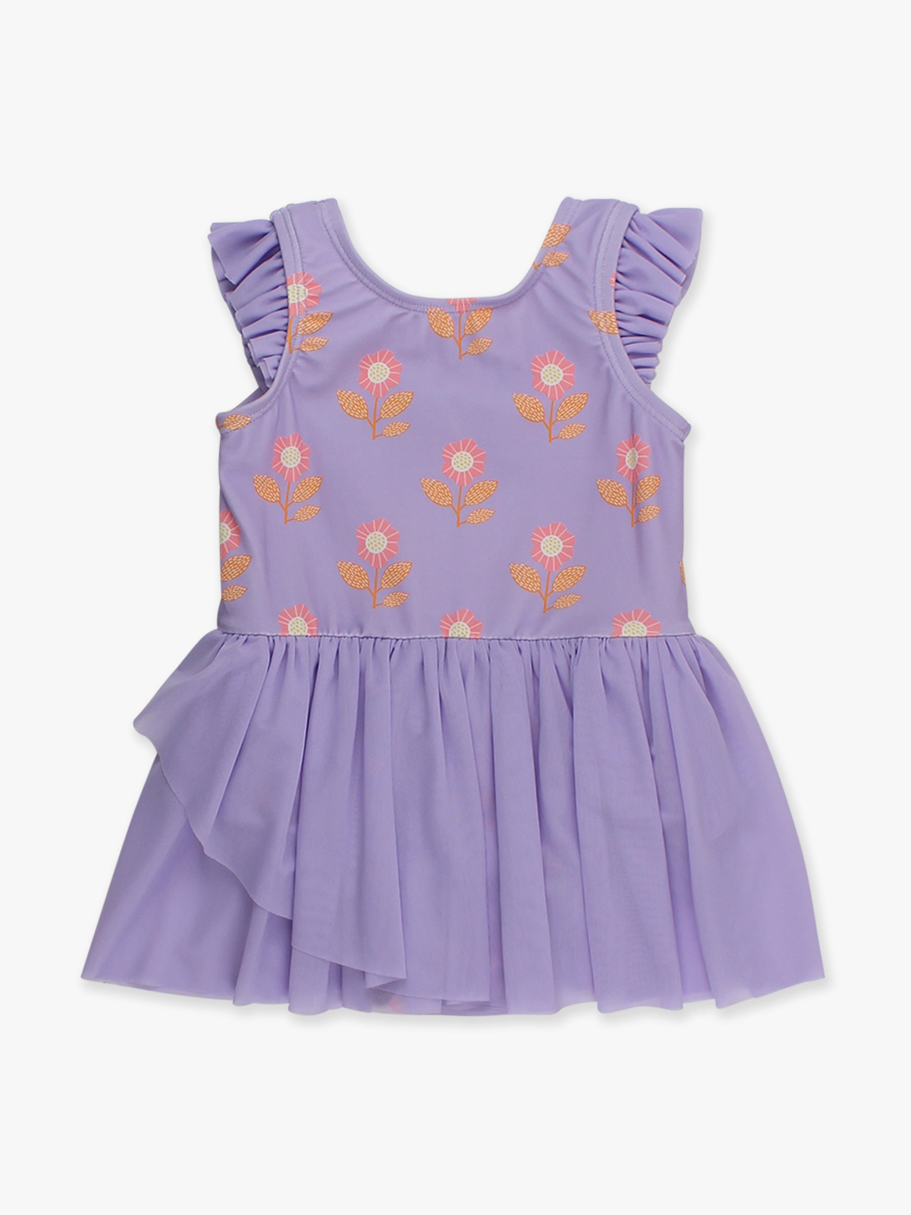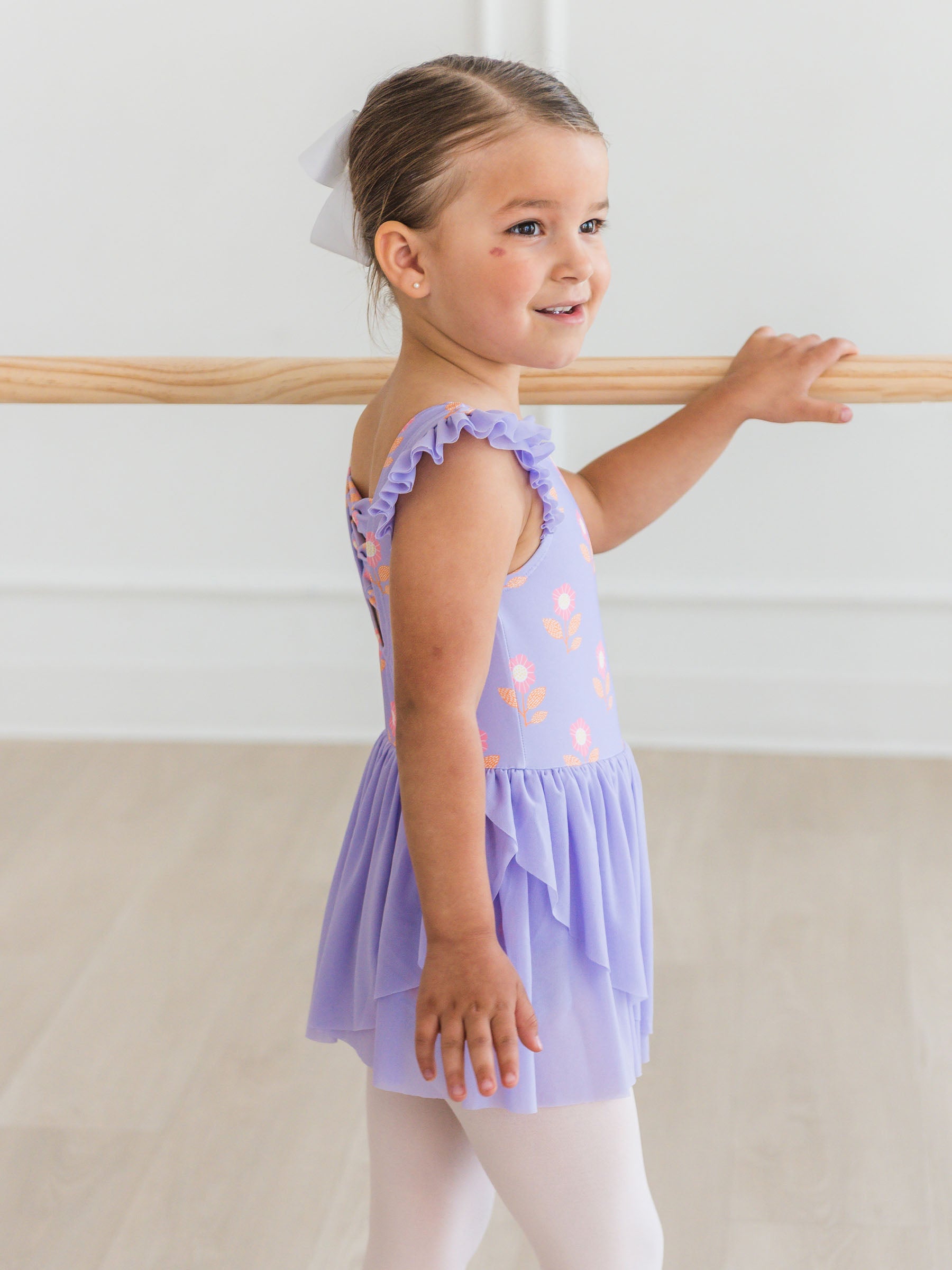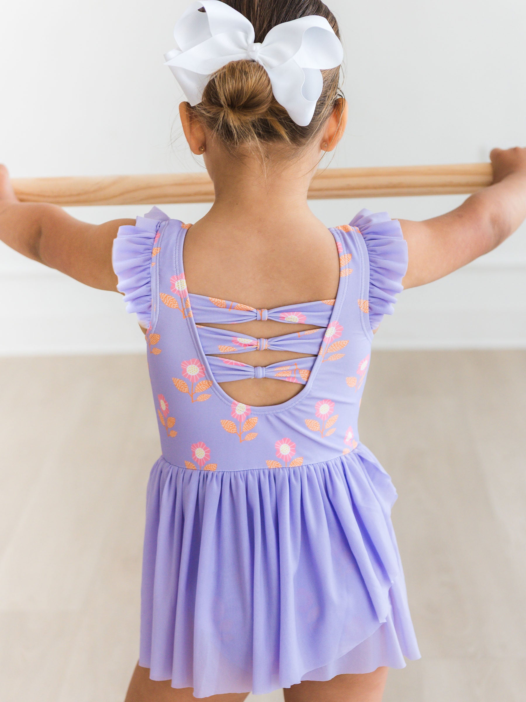 A neat field of blossoms stand out against a soft purple background. This soft and stretchy leotard was made for little dancers! The sweet bow accents at the back add an extra girly touch, and the soft mesh flutter skirt and sleeves make it perfect for twirling all day long!