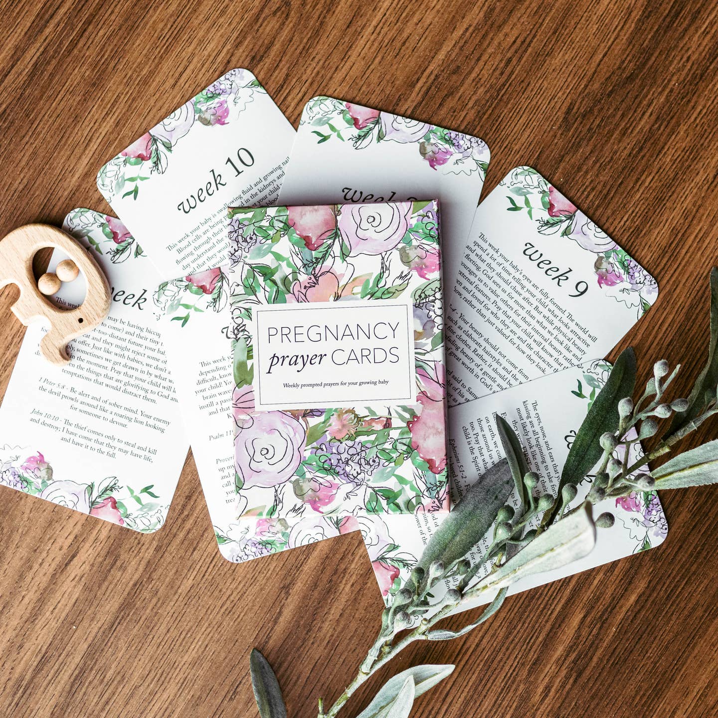 Each week details the development of your baby and how you can pray for them as they grow. For instance, when their hands and feet begin growing in week 7, we pray that they would learn to be the hands and feet of Jesus and serve others. Or in week 21 when their tongue is fully formed, we pray that they would use it to encourage others instead of tearing them down. - The cards are gender neutral so they can be used even if you don't know the gender. - There are 20 cards (back and front) that cover the 42 weeks of pregnancy (weeks 1-4 and 41-42 are together). - Each week includes scripture to pray or memorize that matches the prayer request (All references in NIV).