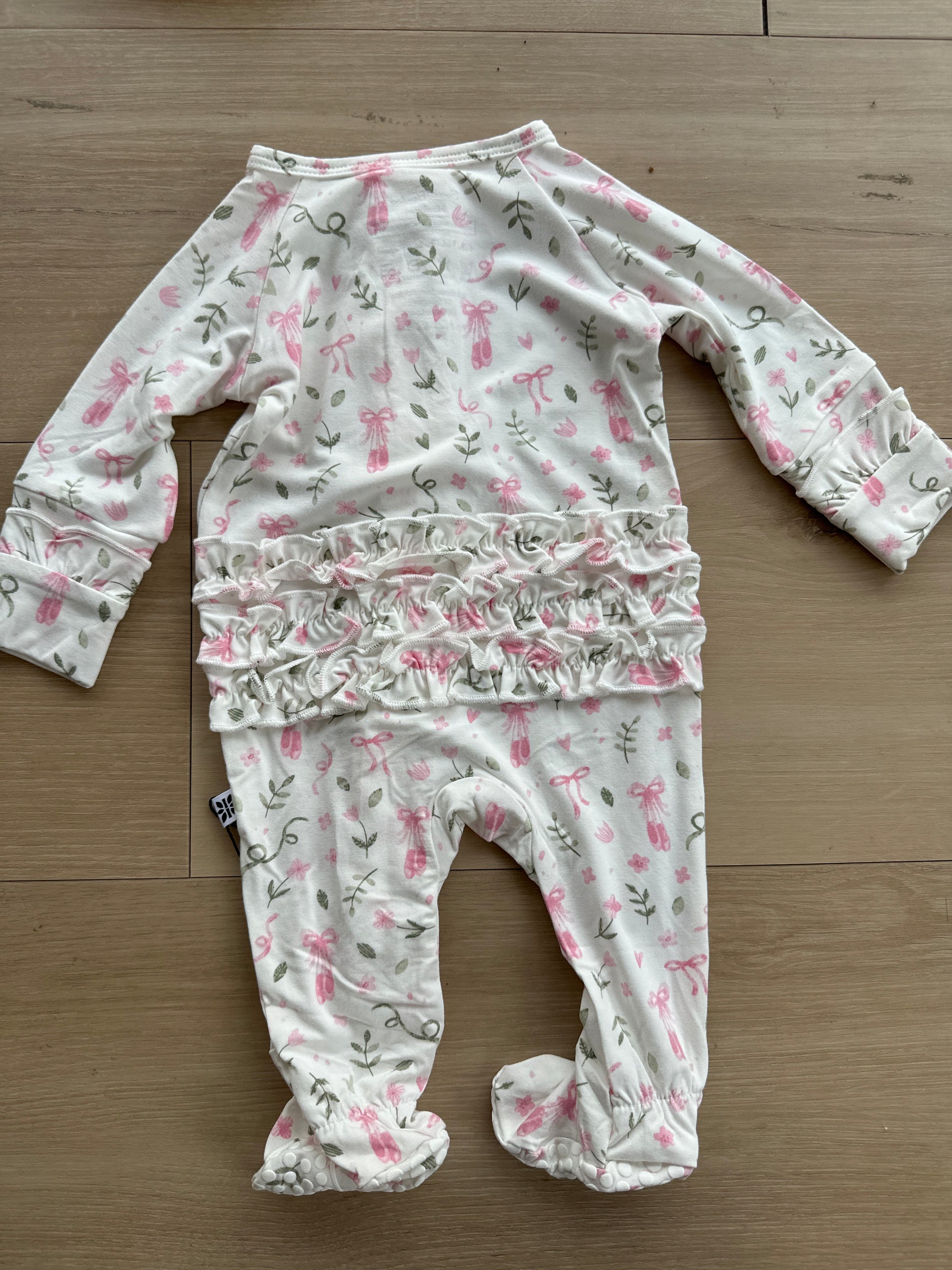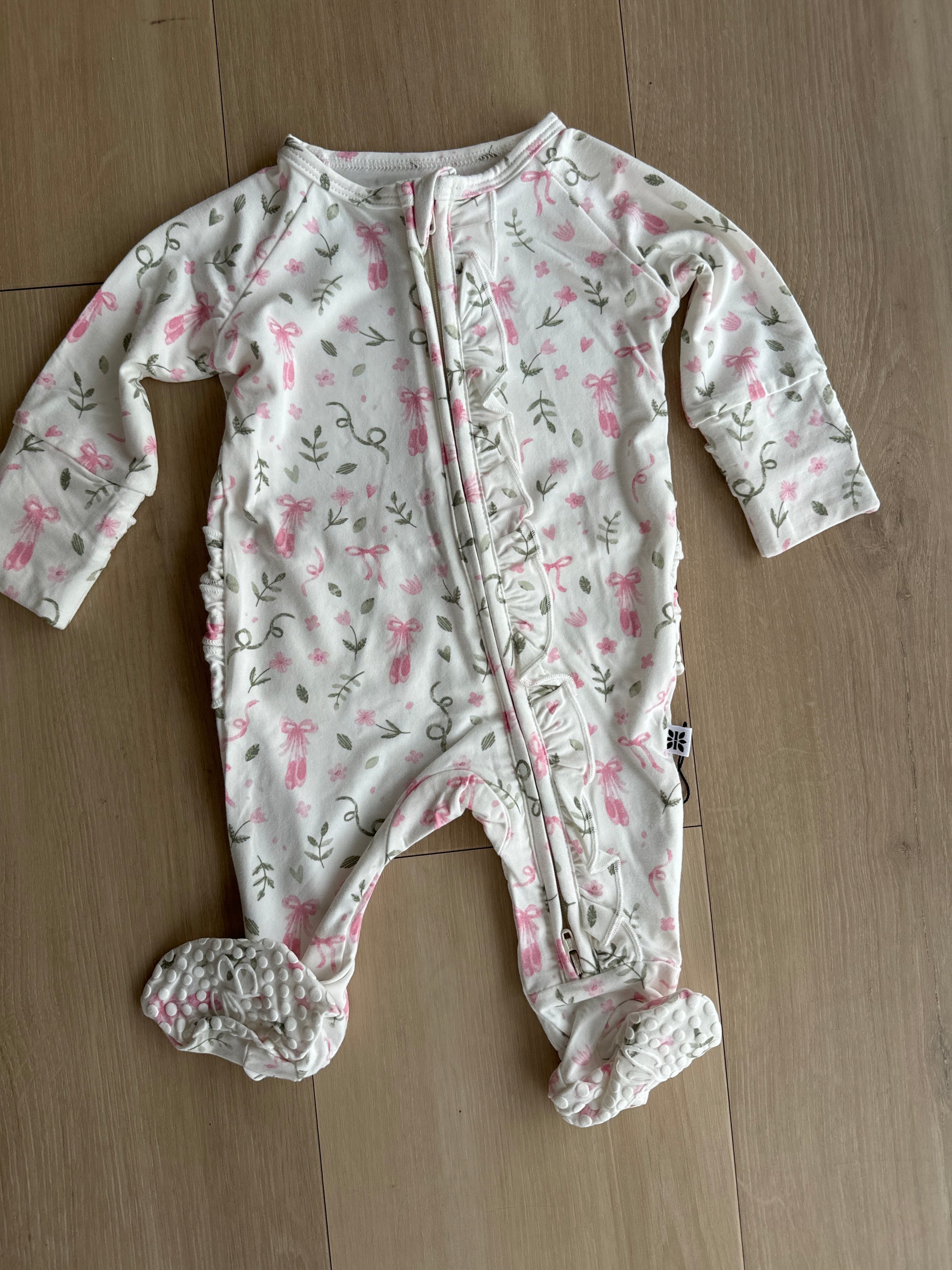 Made with our yummy, hypoallergenic, silky-smooth bamboo fabric and topped off with no-slip grips on the foot pads to ensure your little one stays stable as they grow. * 2-way zip for easy changing * Ruffle details on bottom, shoulders, and sleeves * Non-slip grip foot pads * Tagless size label for total comfort * Safe for sensitive skin