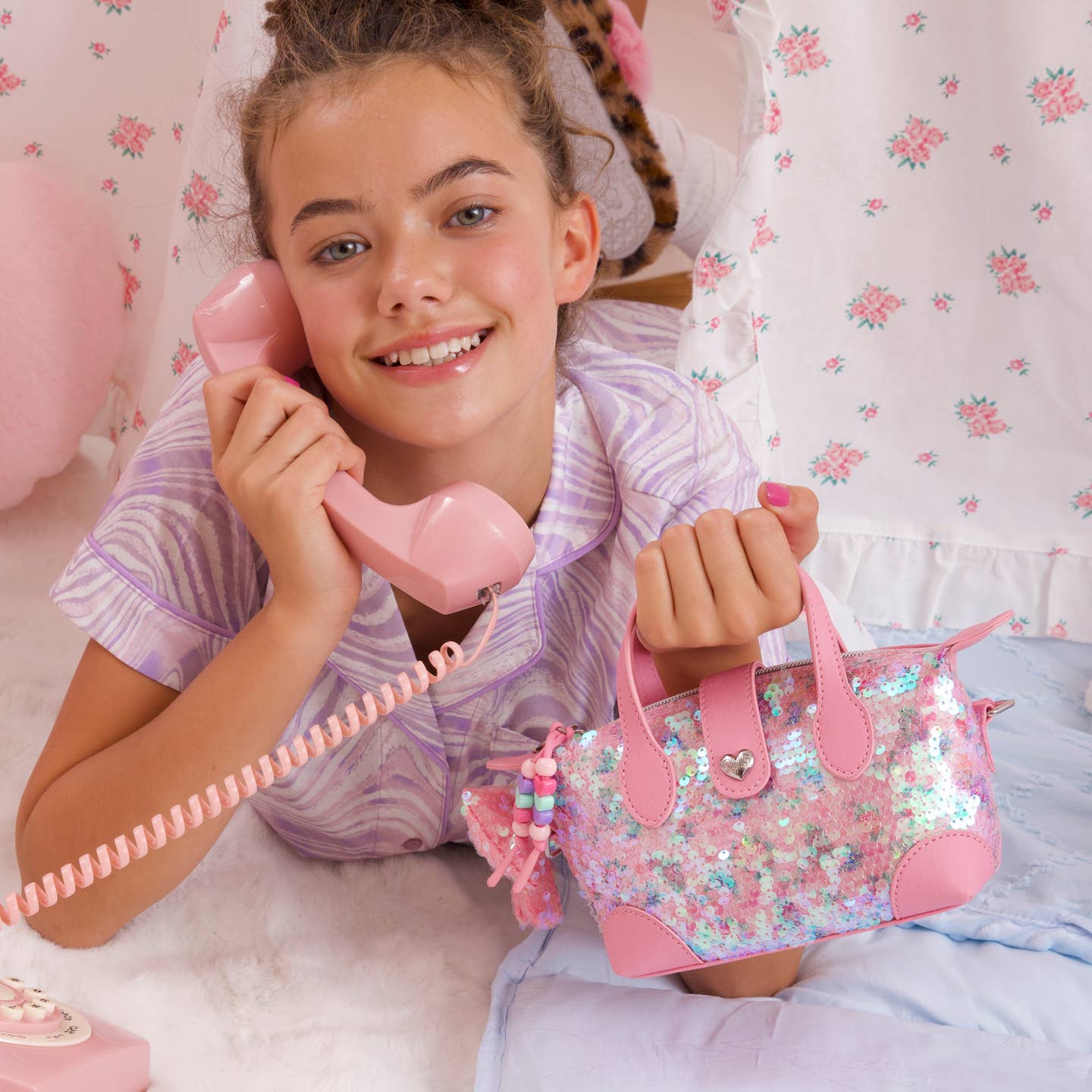 The Sequin Floral Printed Mini Pouchette with Charm from OMG Accessories is a must-have for your stylish kids and tweens. It's not just a crossbody bag, it's a unique accessory that adds a sparkle to their outfit. Designed with our unique blend of big ideas and timeless inspiration, this bag is sprinkled with glitter, perfect for the ultimate mini fashionista.