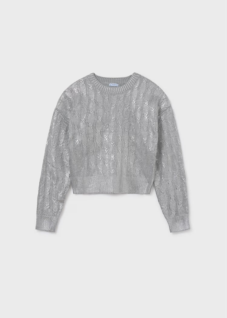 Silver cable knit sweater. Coordinates with silver Mayoral skirt.