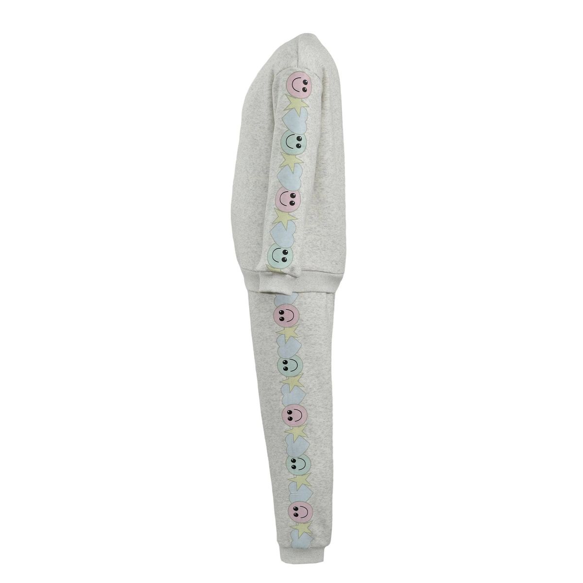 - Features adorable pastel smiley faces, stars, and hearts running down the sleeves and pant legs.