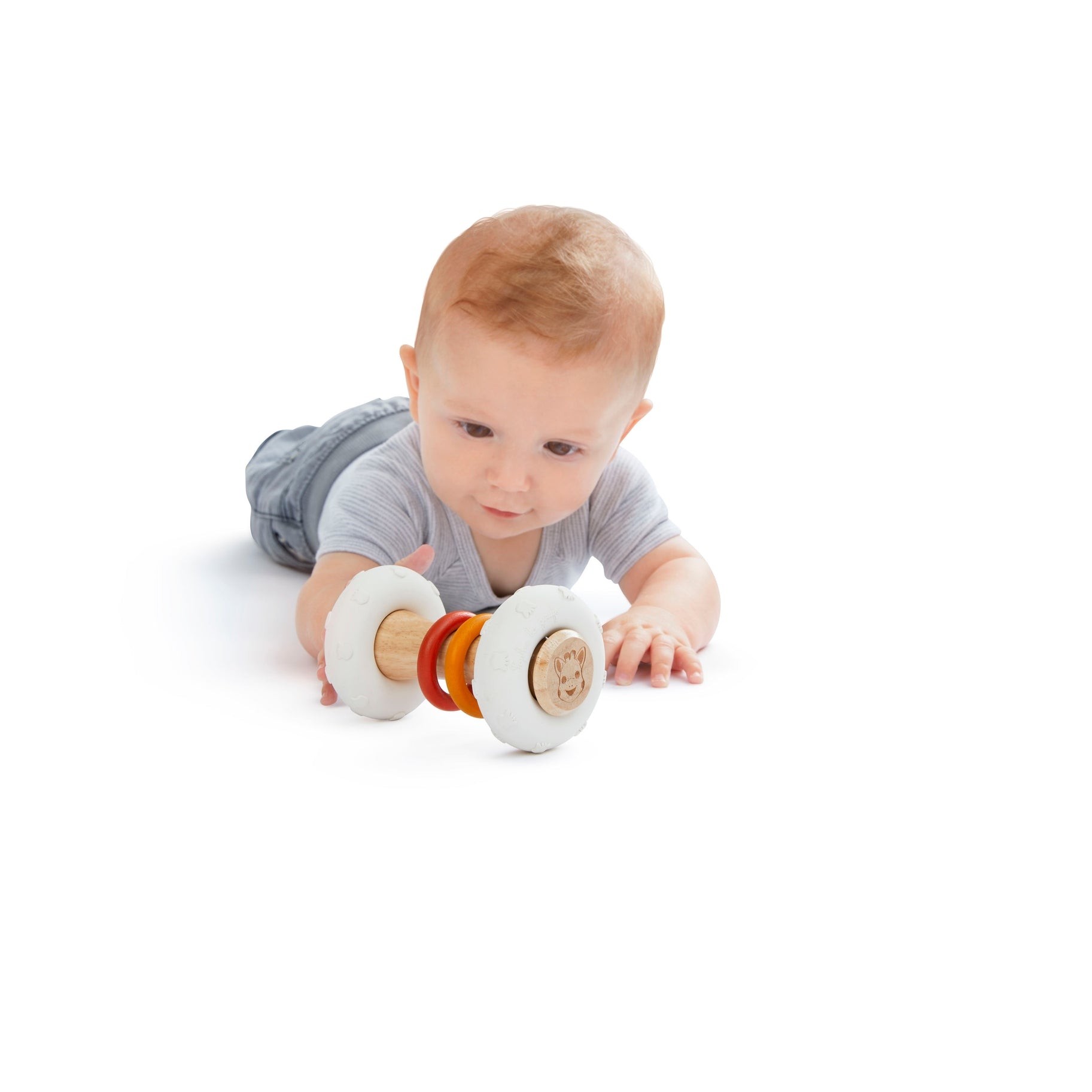 This rattle has everything to stimulate the baby's senses: - Little balls inside the handle and 2 wooden rings to listen to while they bang together - Two different materials to vary the sensations of touch - 2 colorful teething rings made from rubberwood to make some clatter - 2 removable parts made from 100% natural rubber with a textured surface to chew