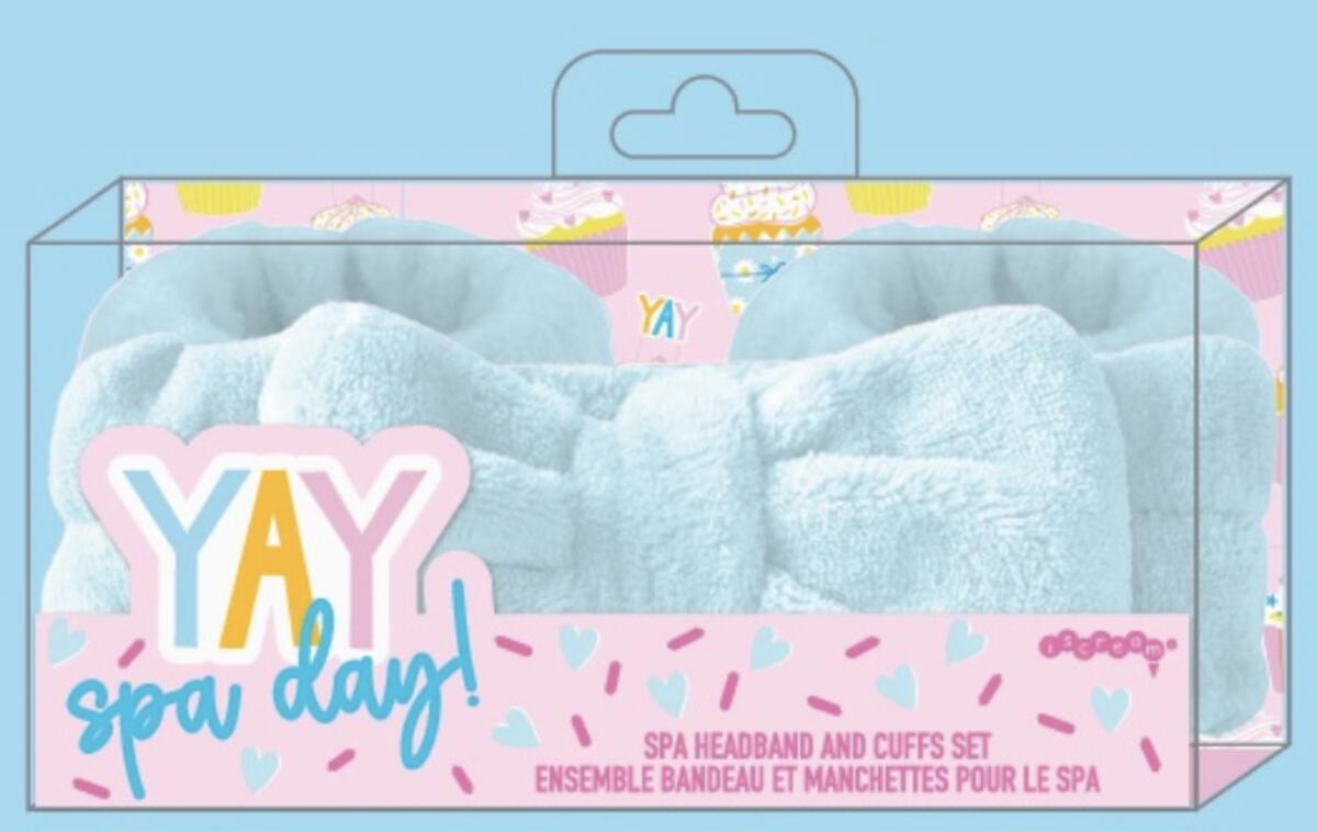 Aqua Plush Bow Headband and Cuff Set in ready-to-gift packaging.