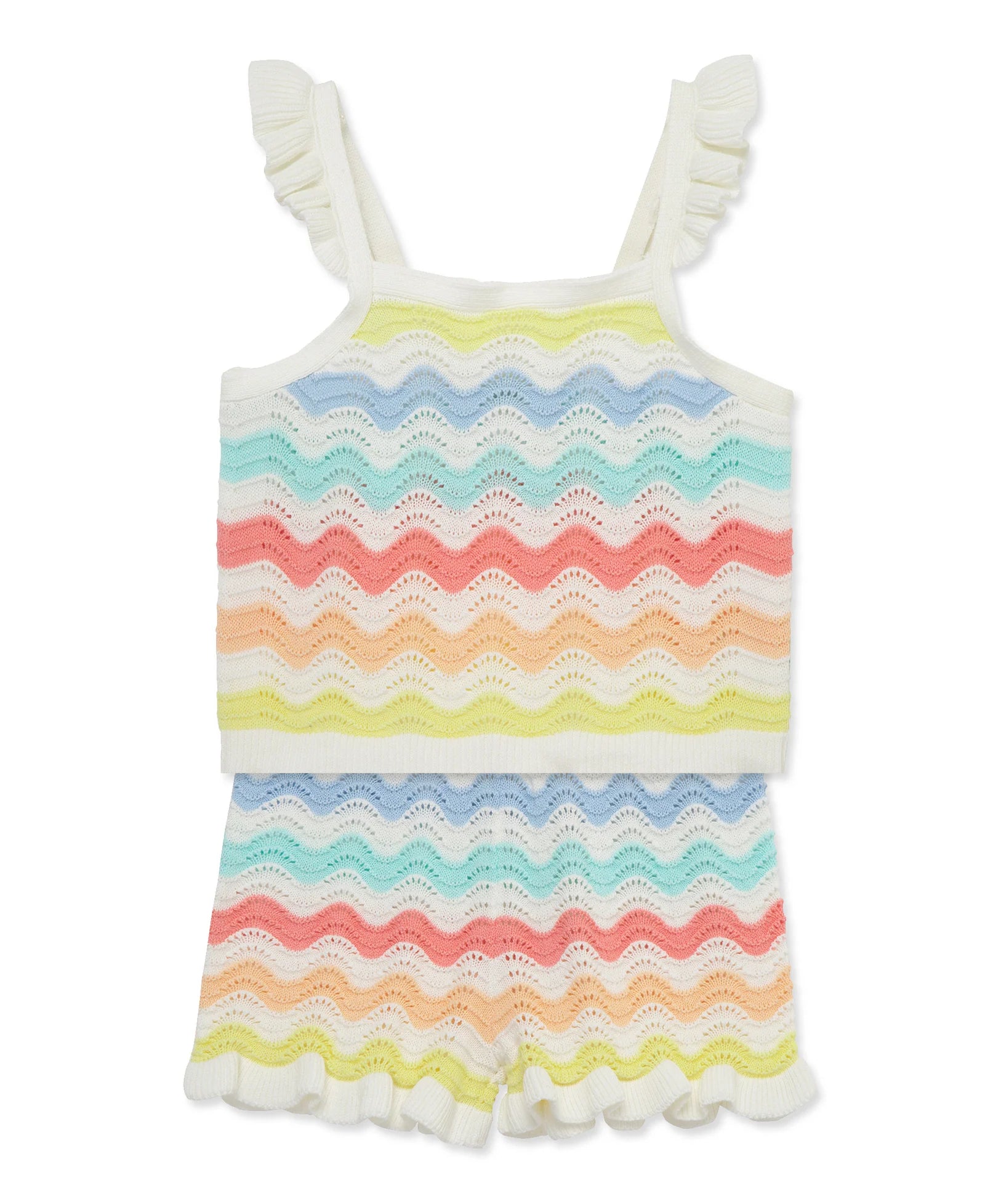 - Show off her groovy side in this girls' cotton pointelle knit set, featuring the matching colorful wavy tunic and shorts! 100% Cotton