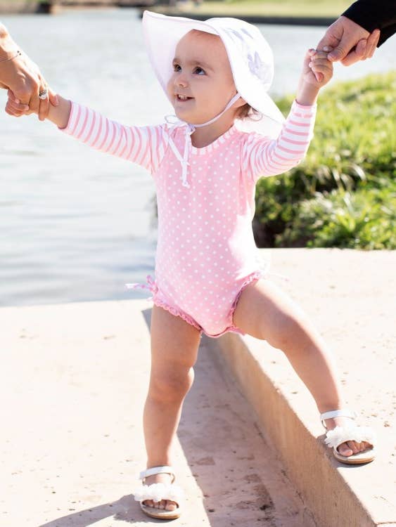 Keep your little one safe from the sun with this sun protection hat. The tie chin strap and fit securing toggle will ensure a snug and cozy fit, even for extra windy days. Perfect for mommas and babies on-the-go! Pair this white wide brim hat with your favorite RuffleButts swim so they're ready for fun in the sun.